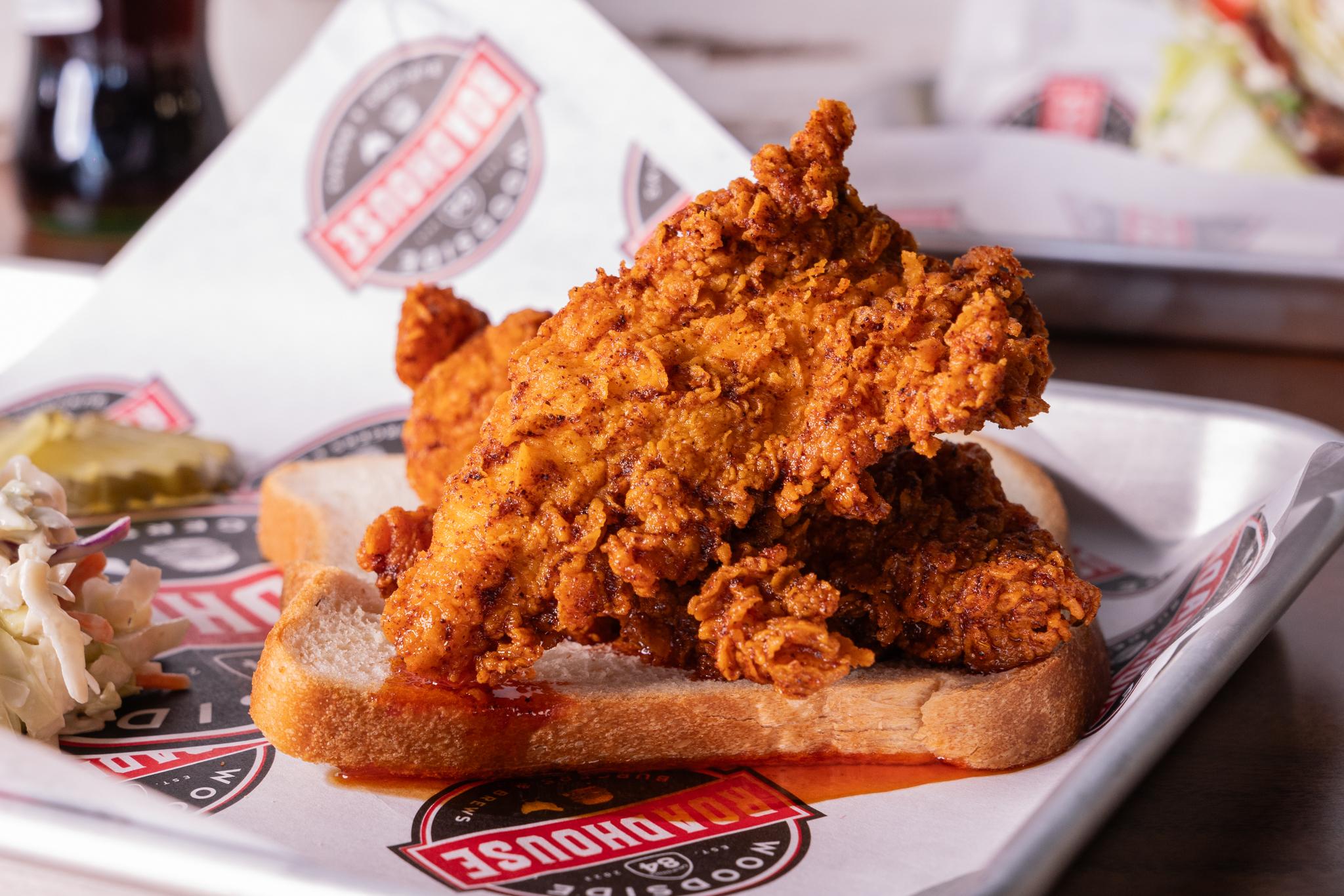 Crispy Chicken Tender, Sliced Bread, Pickles, Road Sauce