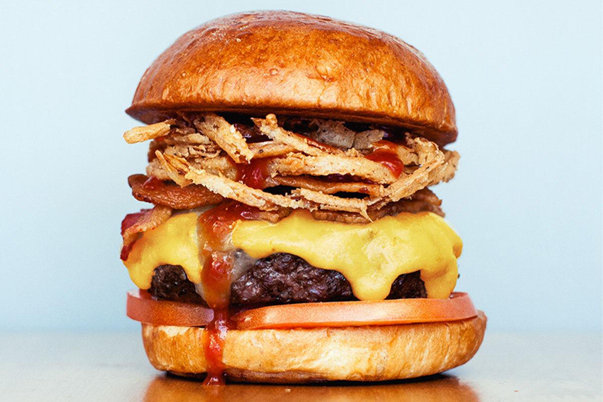All-natural angus beef • jalapeño jack • cheddar • lettuce blend • tomatoes • pickles • fried onion strings • bourbon BBQ sauce • brioche bun